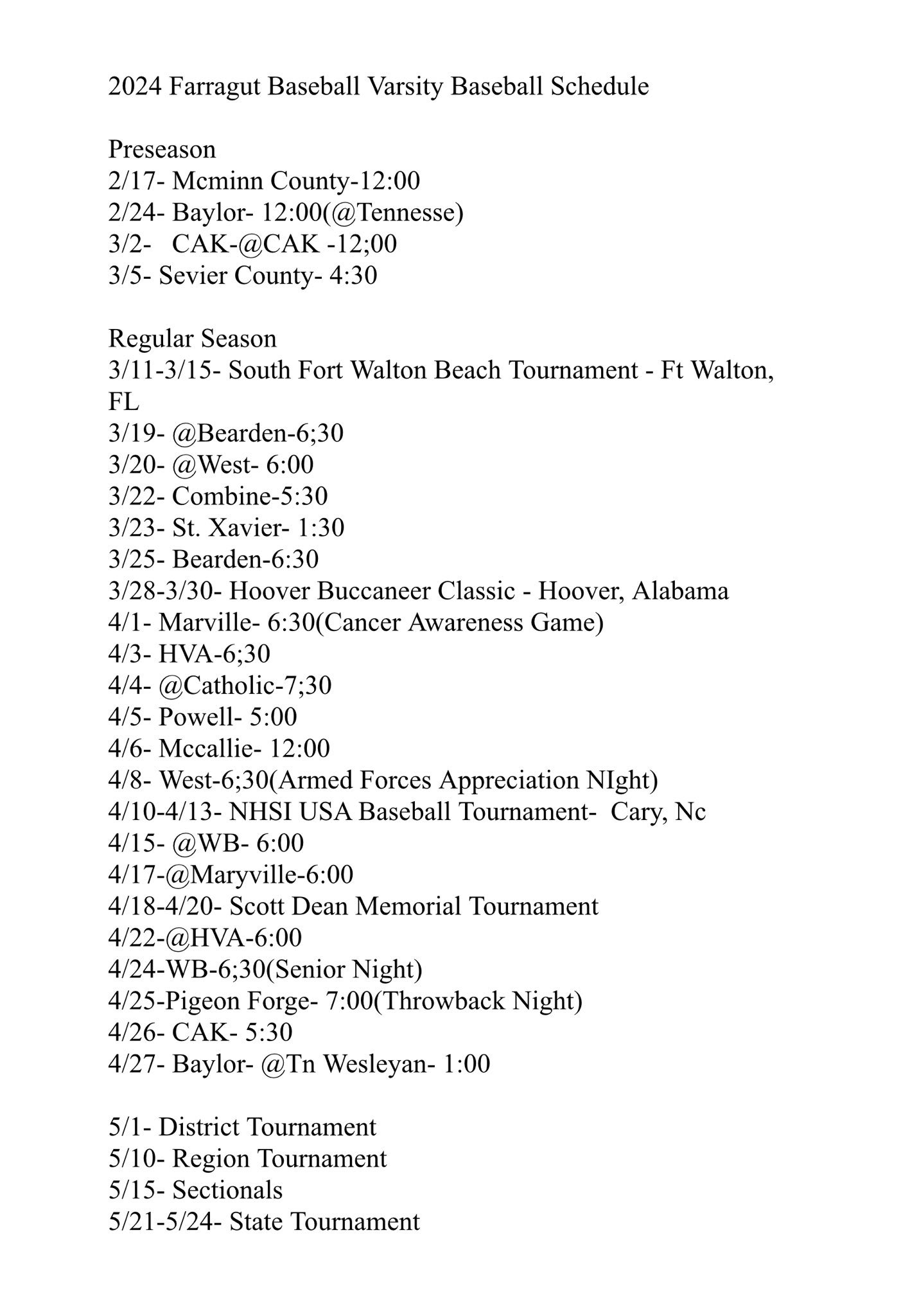 Farragut High School Baseball Schedule 2024 – 5 p.m. – Greenfield-Central vs. Fishers in Mt. Vernon Regional championship 5 p.m. – Adam Koon (Mt. Vernon) vs. Farrar (Richmond)/Saylor (Centerville) winner Mt. Vernon Individual Sectional . The path toward defending its status as champion of the SEC East, and making another run in the Men’s College World Series, has been laid out for Florida as its 2024 baseball schedule was revealed .